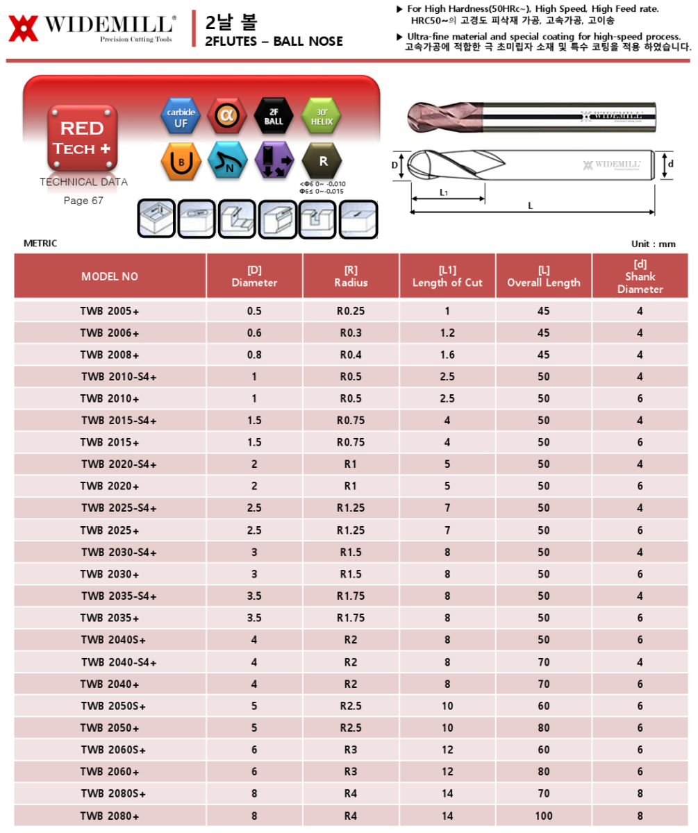 2 Flute Ball Nose Carbide with AlTiCrN Coating for General Use on materials up to 50HRC.
