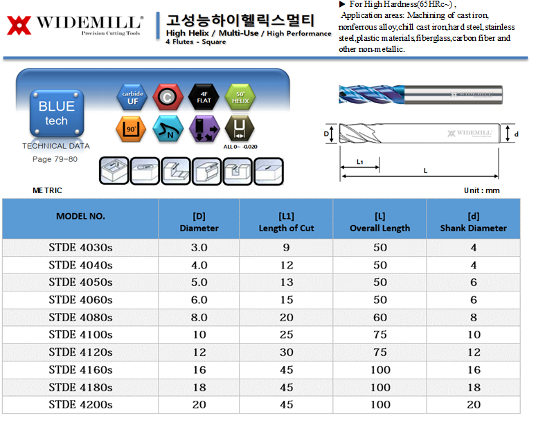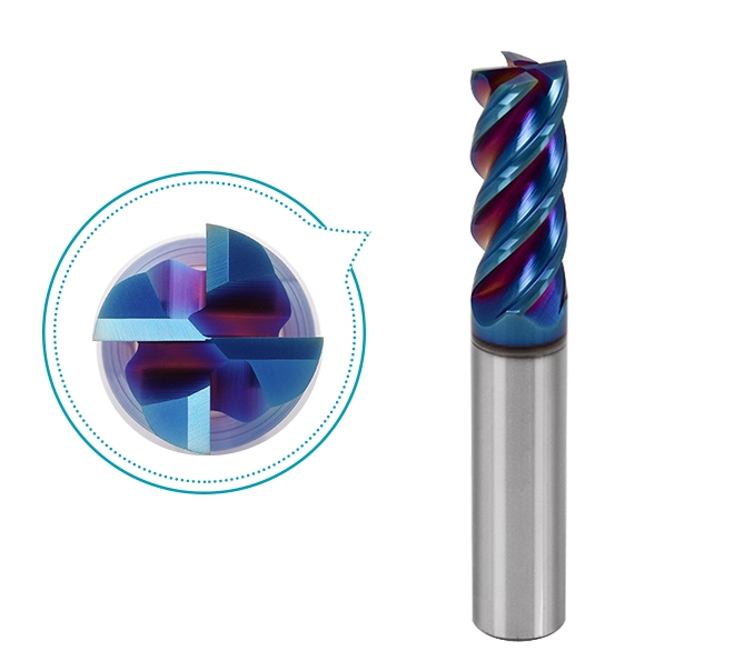4 Flute Square End Mills Ultra Micro Grain Carbide TiAlN F-NaNo Blue Coated for General Use on High Hardness Materials up to 65-68HRC, performs well on Pre-hardened, Hardened Steel 40-50HRC, Hardened Steel 50-60HRC, High Hardened Steel 60-68HRC.
